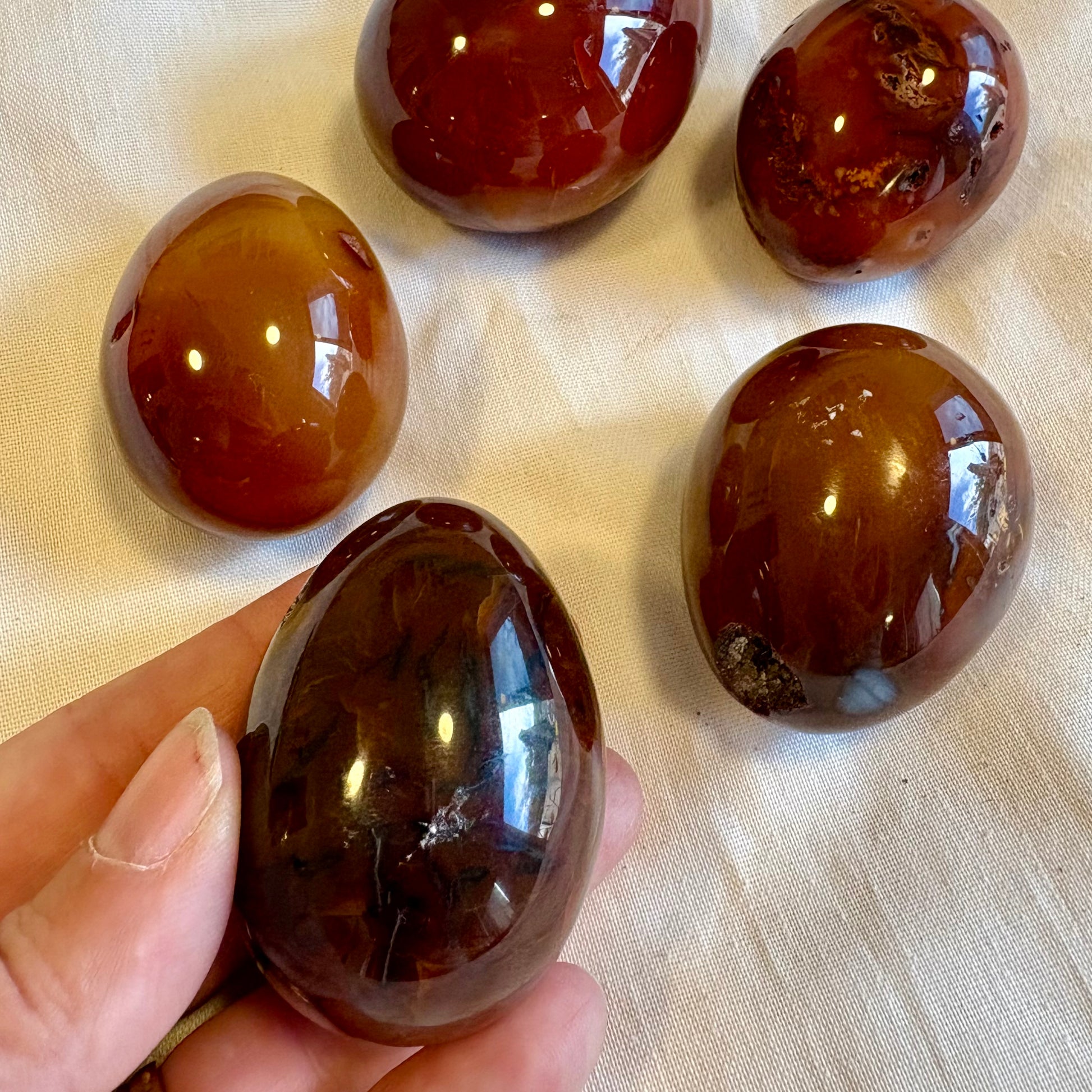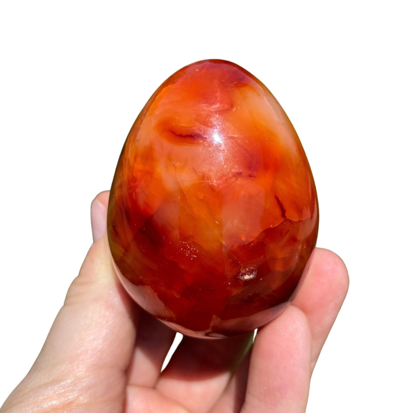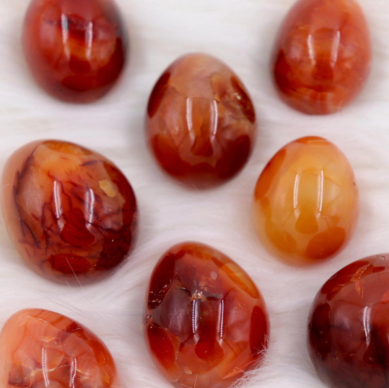 These eggs are a cute addition to your collection. They are a beautiful range of red, orange, and white with some having druzy cavities in them. Your egg will be chosen for you intuitively. They're around 50-60mm long and weigh 100-160 grams each.
