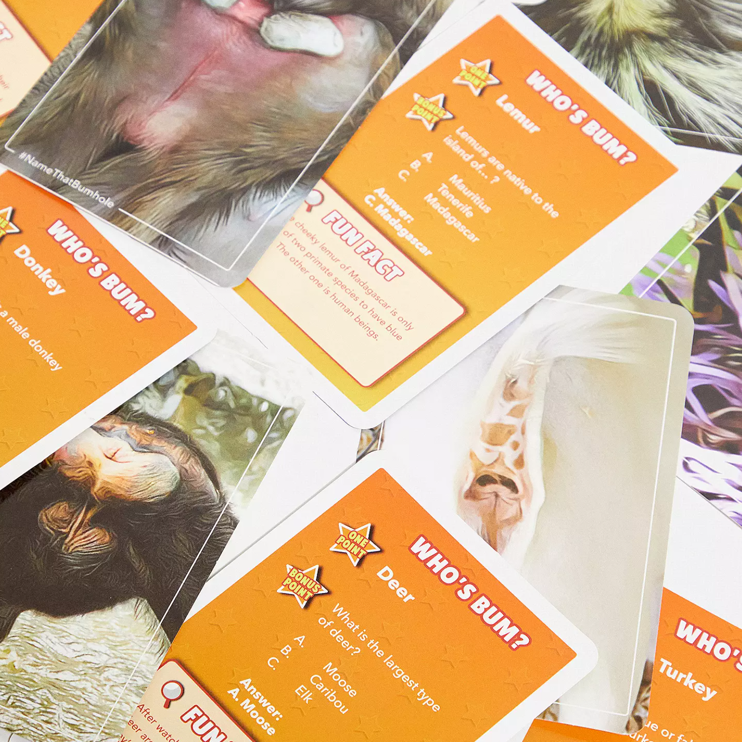 Can players name the animal from the derriere? Is that a turtle or a bumble bee? A gorilla or a possum? Each card includes some bonus trivia so you're learning AND having fun.