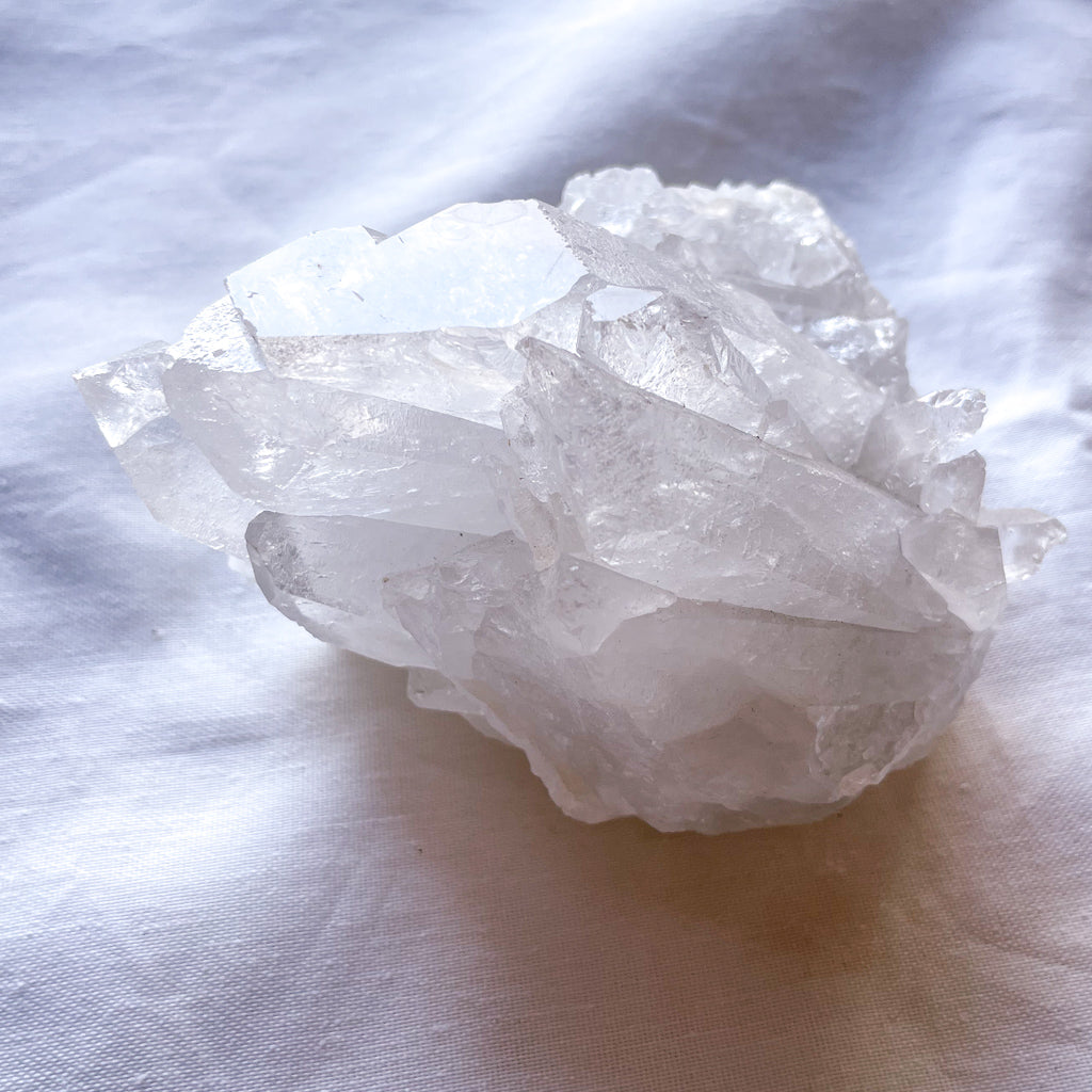 This snow white and clear quartz crystal chunky point cluster emits a soft light filled energy for your desk, coffee table, bathroom bench or bedside table! Place in your home to add beauty and catch the light.