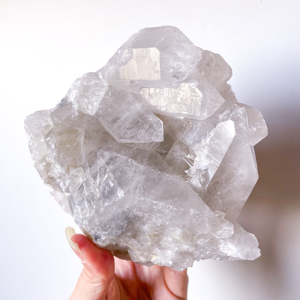This snow white and clear quartz crystal chunky point cluster emits a soft light filled energy for your desk, coffee table, bathroom bench or bedside table! Place in your home to add beauty and catch the light.