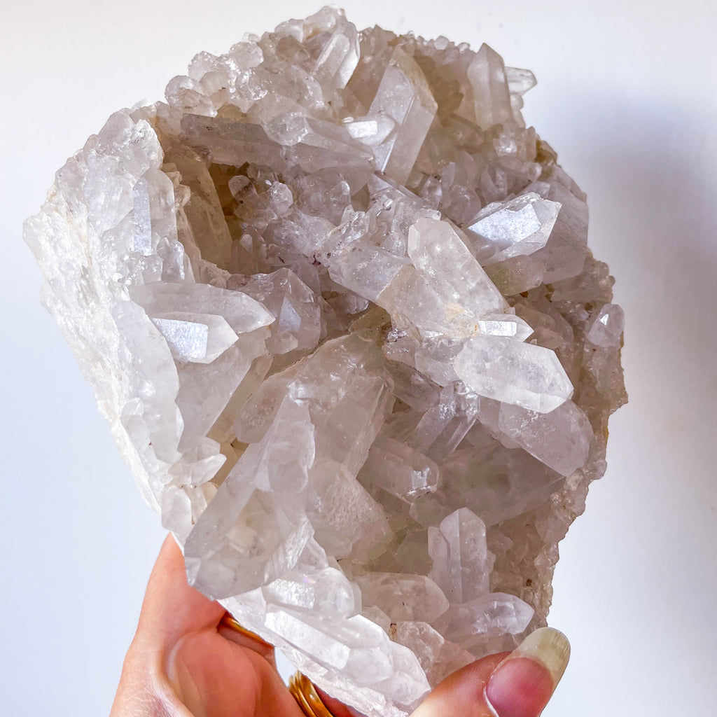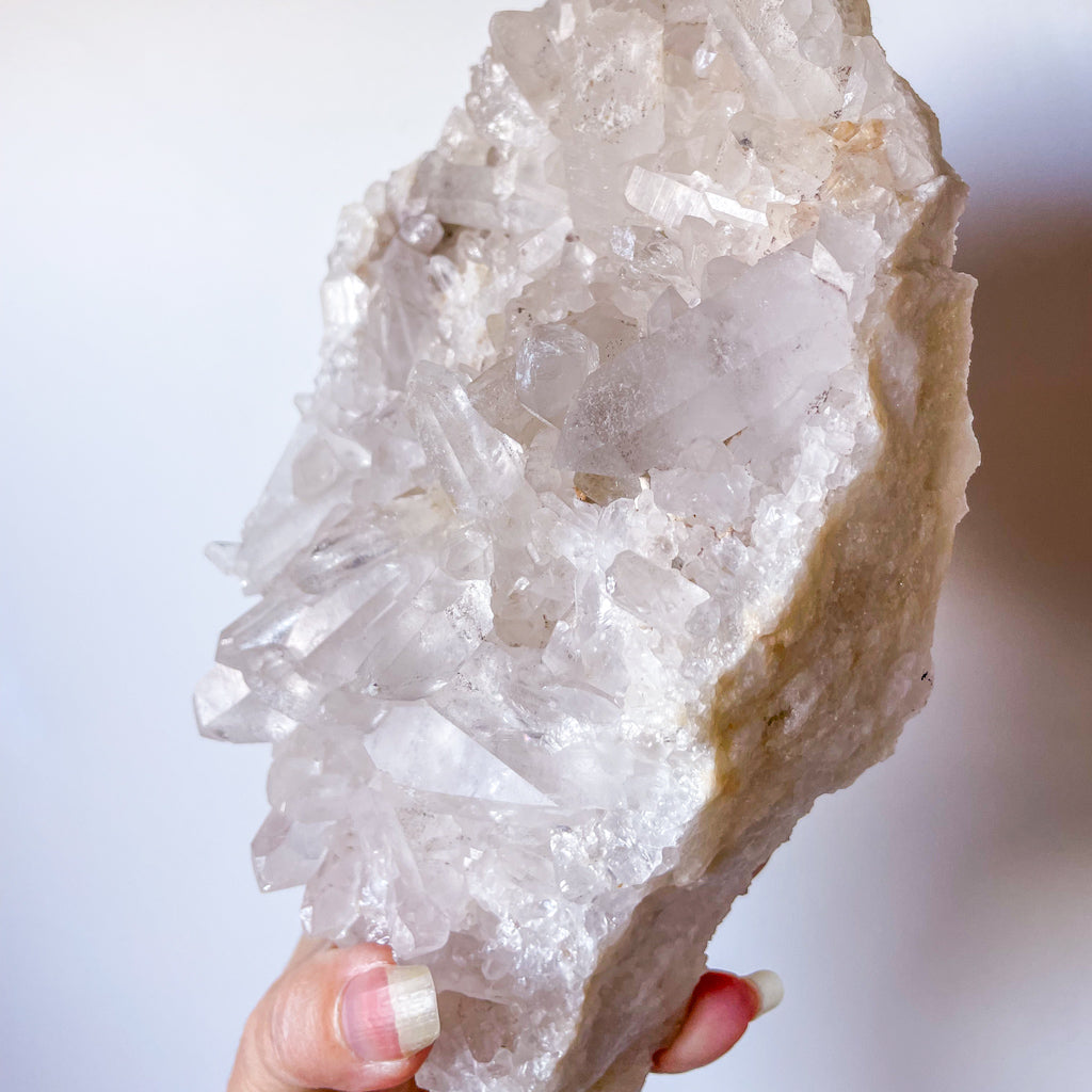 This snow white and clear quartz crystal chunky point cluster emits a soft light filled energy for your desk, coffee table, bathroom bench or bedside table! Place in your home to add beauty and catch the light.