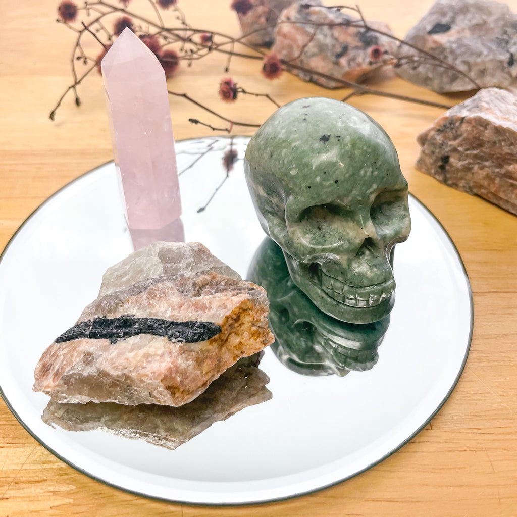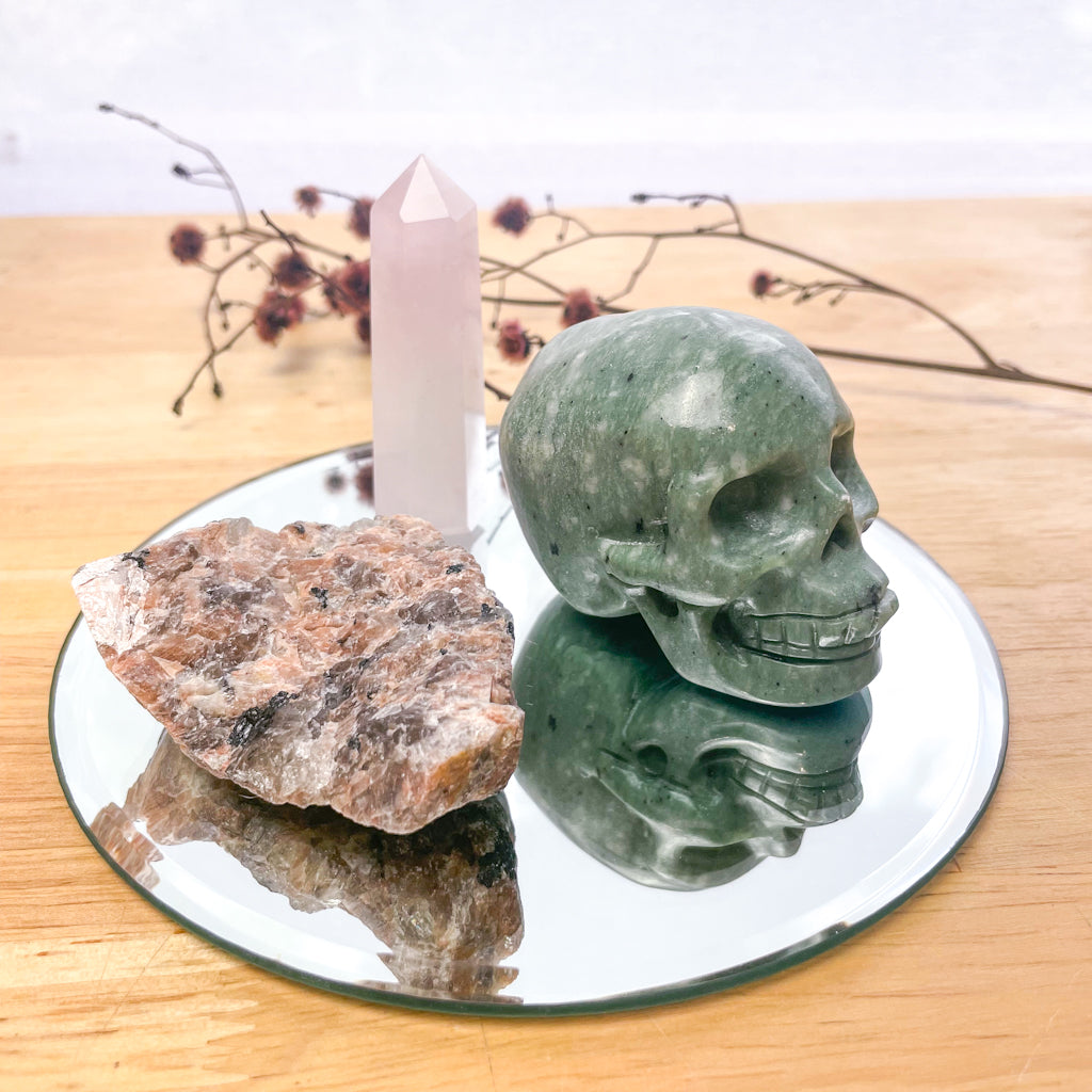 Crystal bundle - Green jade skull, raw unicorn stone and rose quartz tower