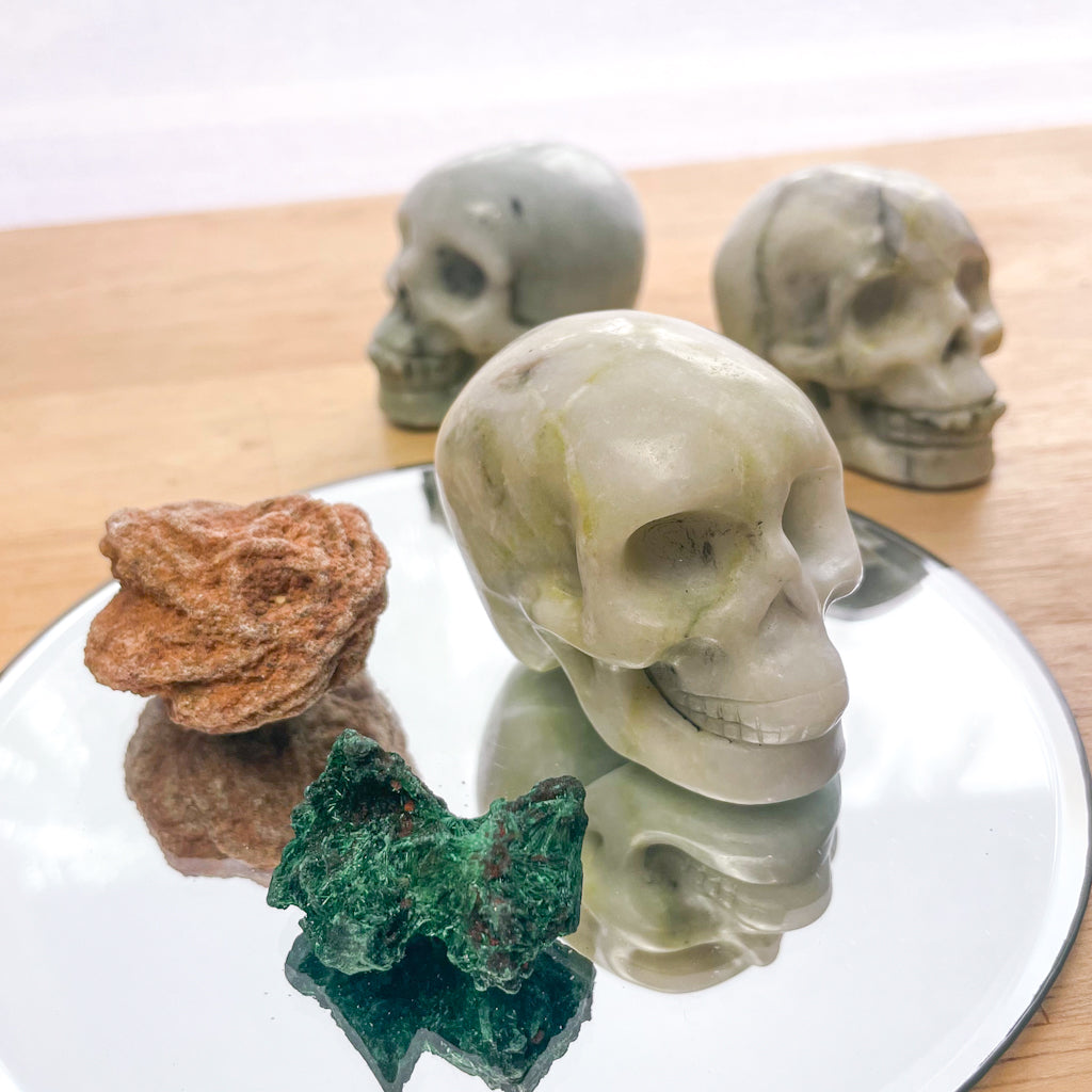 Purchase Crystal bundle - Serpentine skull, desert rose and raw malachite online now from Six things shop Australia.