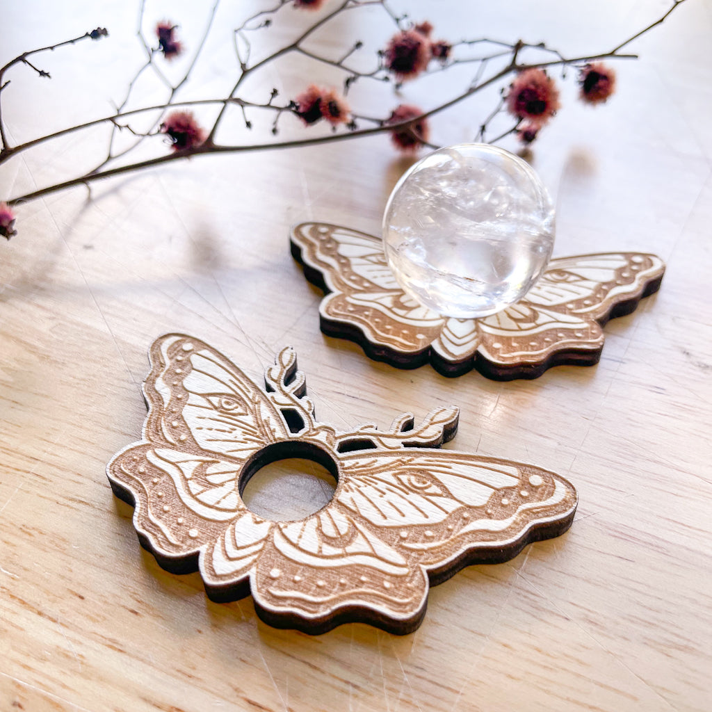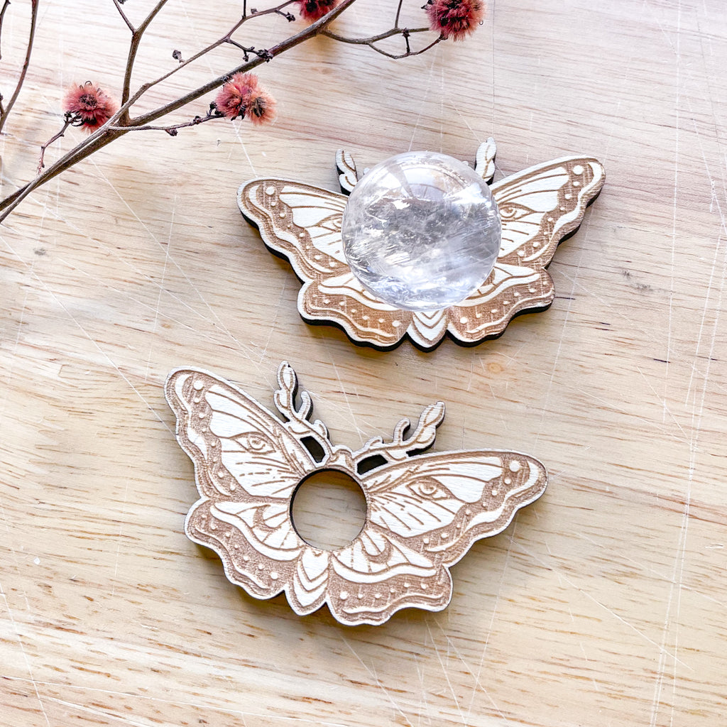 Purchase Death moth / butterfly crystal sphere stand / wooden plate online now from Six things shop Australia.