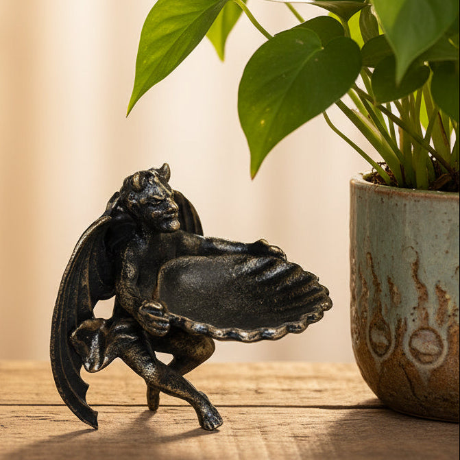 A small cast iron statue of satan / the devil with a shell tray or dish. An interesting desktop keepsake or useful trinket dish or interesting walling hanging.