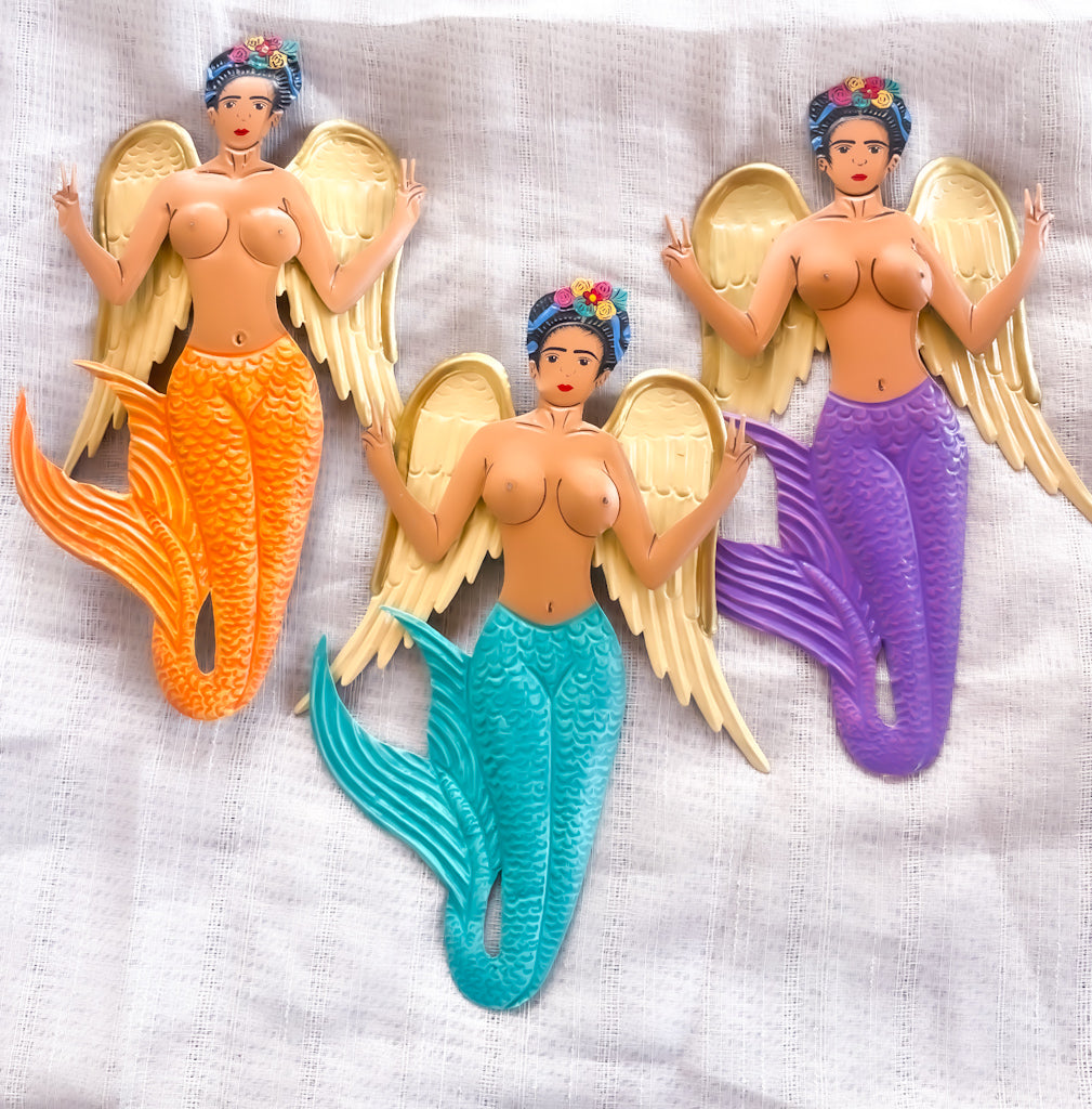 Individually hand-made Frida Mermaid wall hanging decoration made from cut metal and hand-painted to celebrate this Mexican Diva!