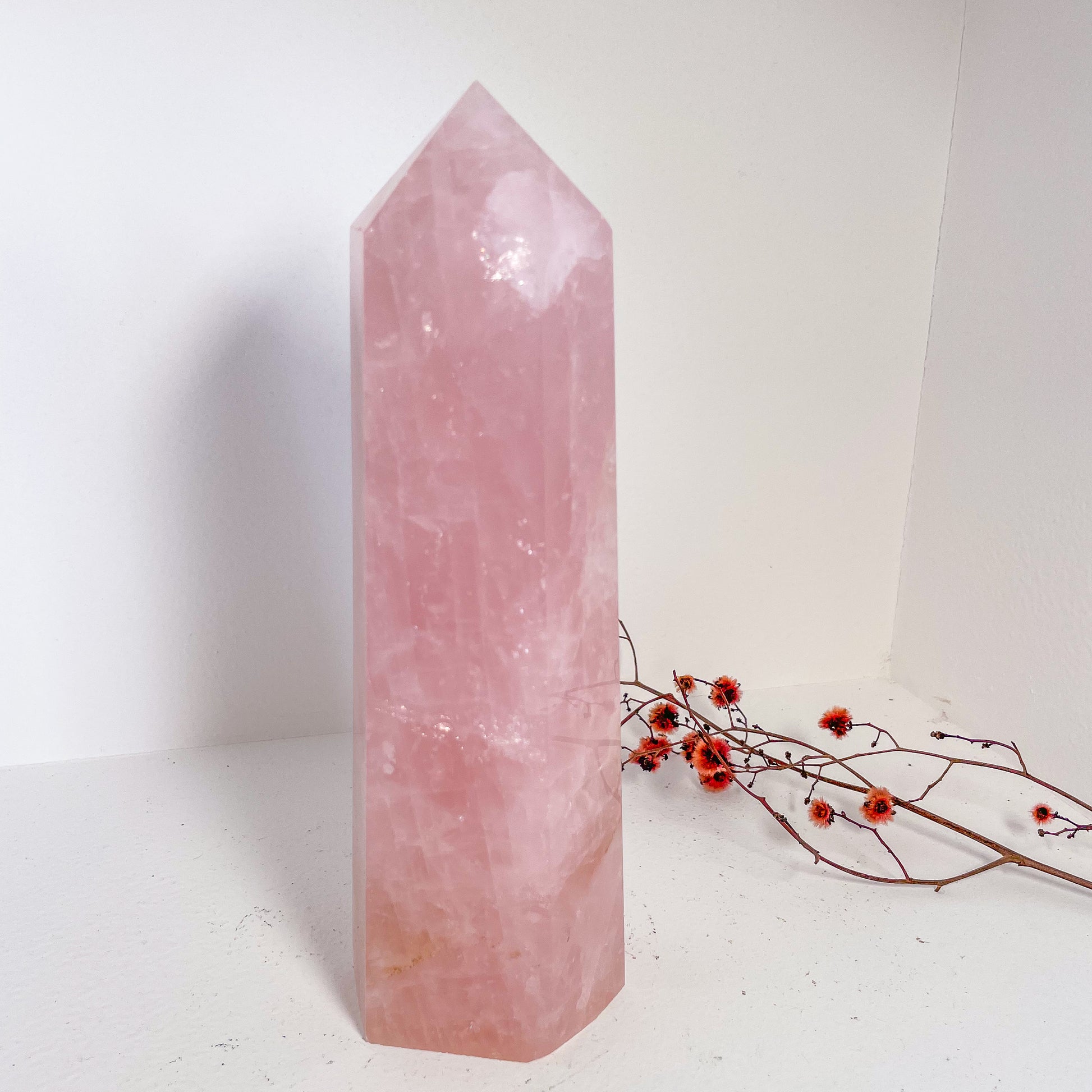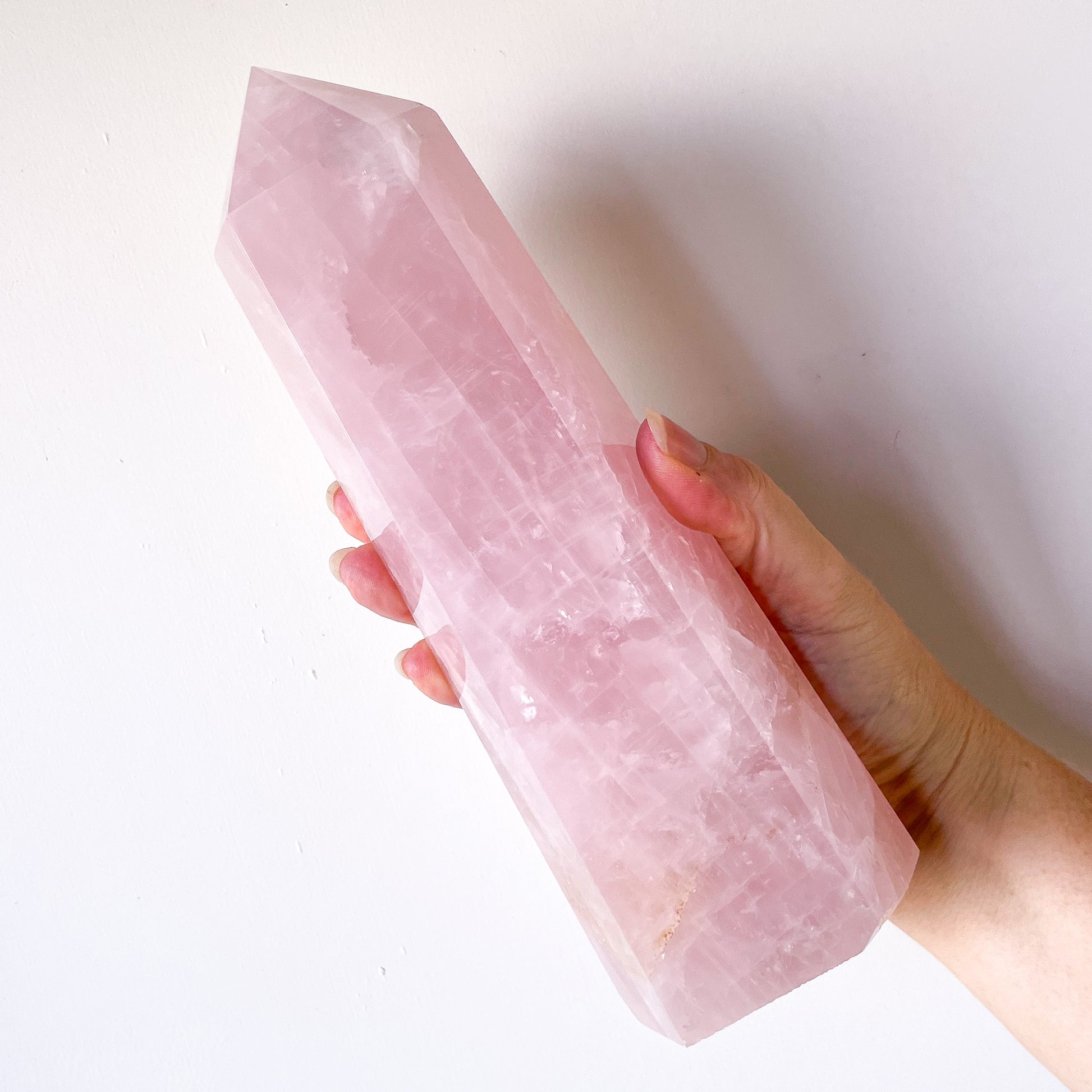 Rose quartz polished crystal extra large point tower pillar perfect to hold whilst meditating or putting on display.