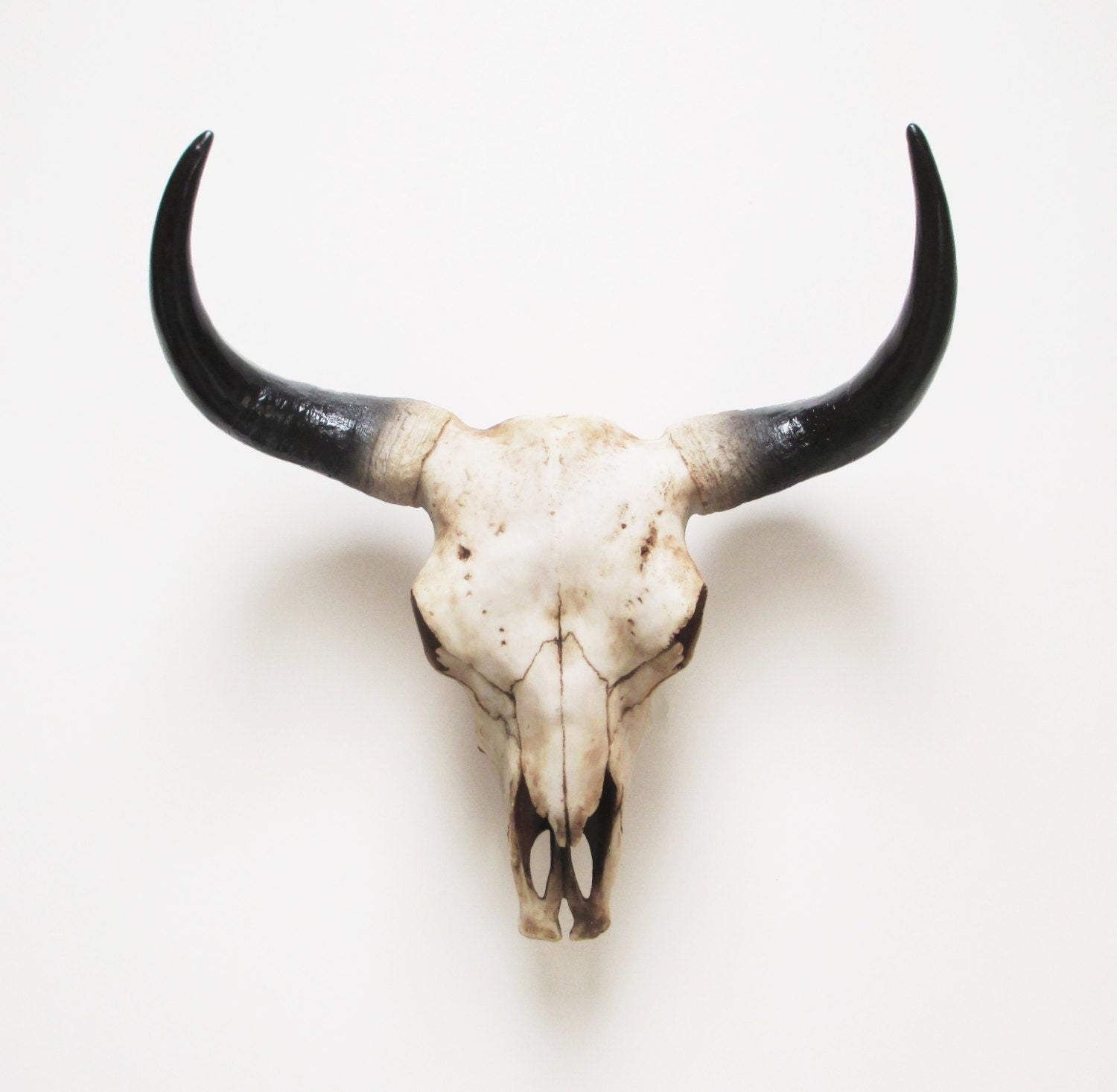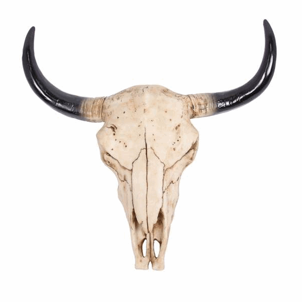It's skull and horns are a stunning feature. Steer skulls are iconic symbols - think Native Americans, cowboys, wagon trains and cattle drives. Ideal for a modern country home, for a skull lover, for adding a masculine element to your room. Shaded in natural tones of bone & white, this is one street smart skull not to be messed with. Behind the skull is a keyhole for immediate hanging. If you prefer not to drill holes in the wall, this skull can lay flat and be displayed on a table.