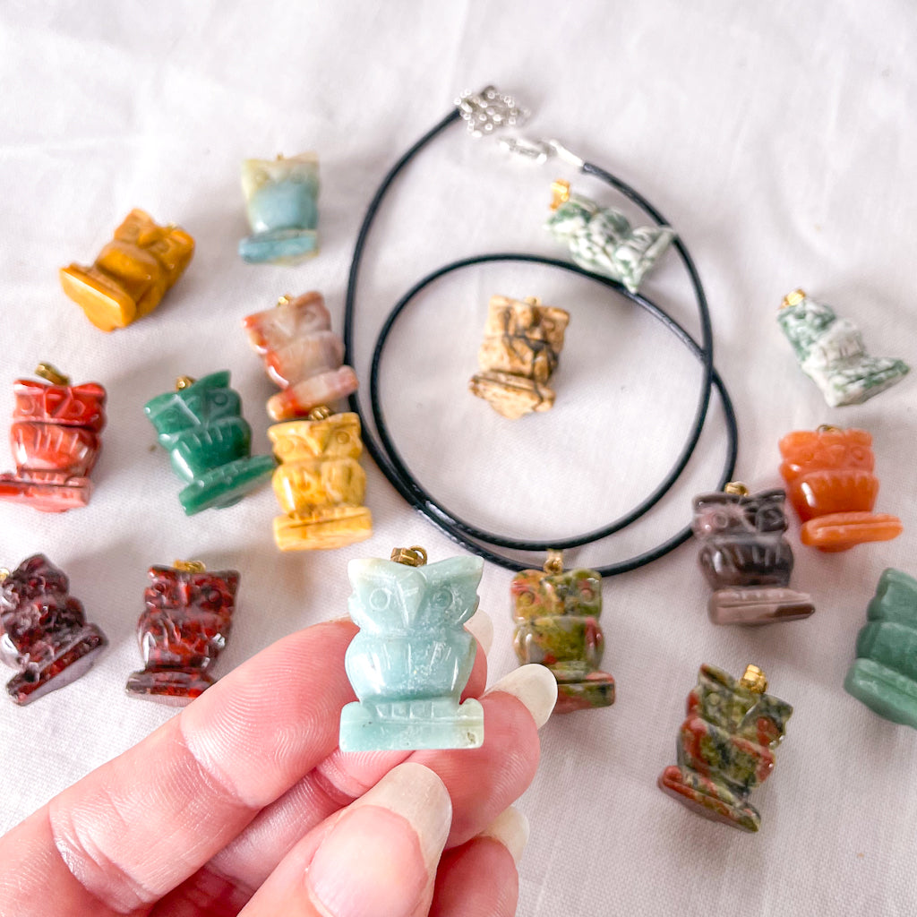 Crystal owl could be: clear quartz, rose quartz, dragon blood stone, Lapis lazuli, Fluorite, sodalite, labradorite, smoky quartz, agate, aventurine, Rhodonite, Tiger eye, jasper, amazonite, Blue stone, gold stone, amethyst, obsidian, flower agate, opalite. Each crystal is unique and beautiful. The one pictured is an example and is not the actual crystal you will receive.