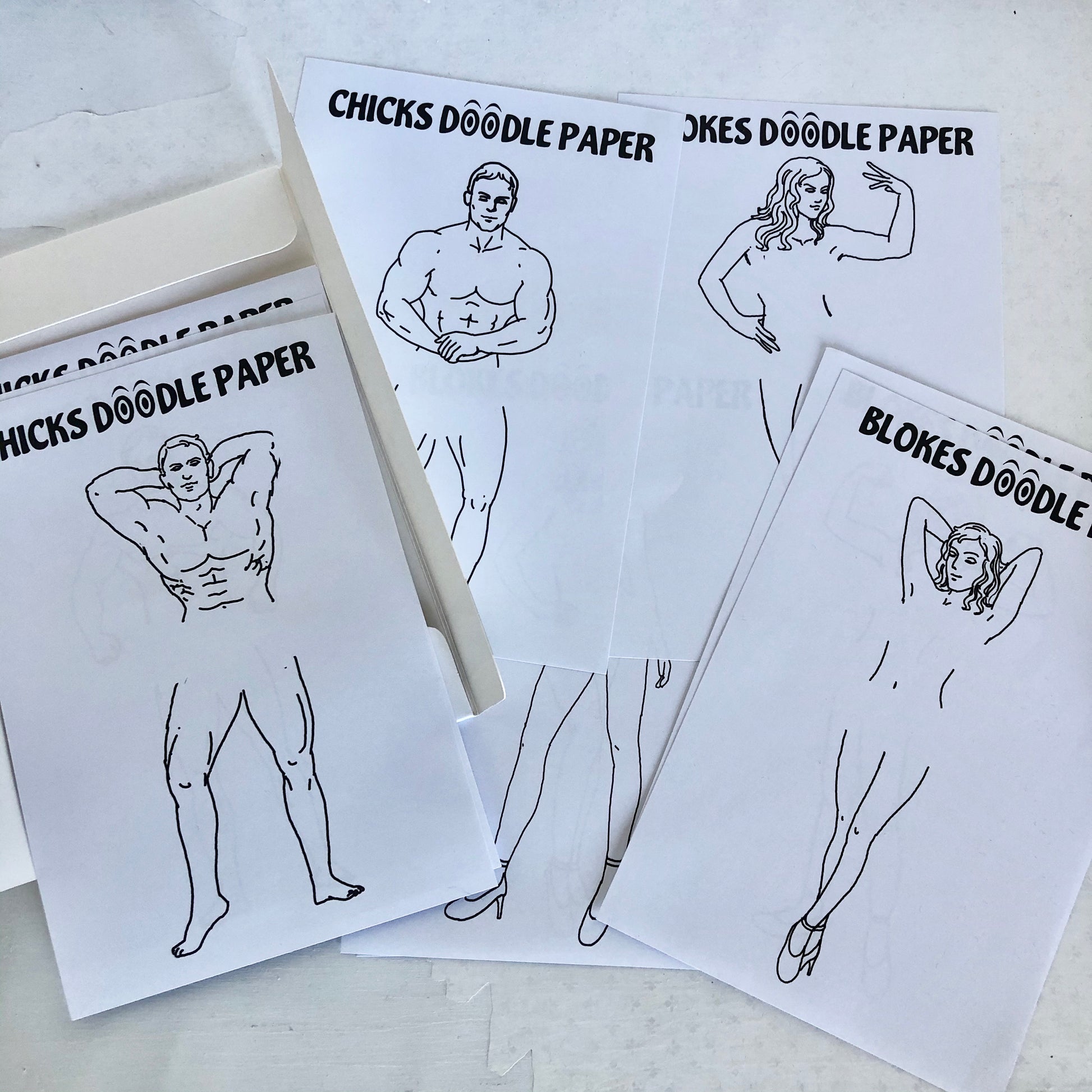 Blokes and chicks doodle paper.... add this missing bits, or add fun things to cover their private parts.