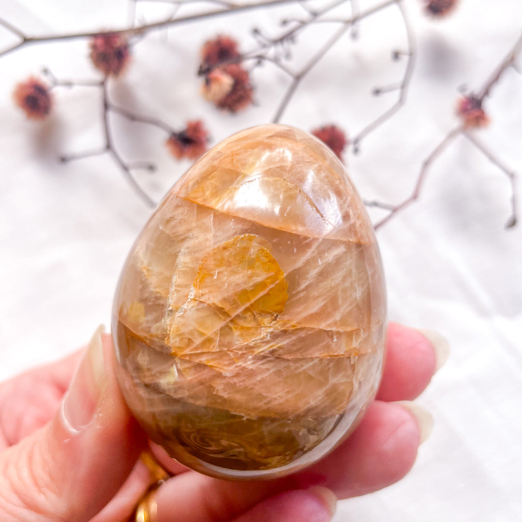 This Peach Moonstone egg is a must-have for crystal enthusiasts. With its beautiful peach hue and flash, this crystal is perfect for meditation and promoting emotional balance.