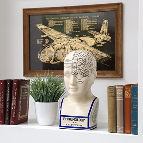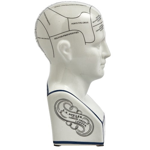 Phrenology Head Large Porcelain. A fantastic oddity to complete every aspiring medico's desk. This is a wonderful and informative ceramic bust based on the pseudoscience of phrenology. Phrenology is the study of the human skull. It is based on the concept that the brain is the organ of the mind, and that certain brain areas have specific functions. An American leading phrenologist of his time, L.N. Fowler, gained considerable fame with his phrenology head, which has become a symbol of the discipline. This bust is made from ceramic, and hand-painted in an antique white crackle finish with a phrenological map of the different faculties. This bust would be a great addition to libraries, doctor`s offices, book shelves or your favourite creativity area! It is a very ancient object of study. The first philosopher to locate mental faculties in the head was in fact Aristoteles. Hand painted Phrenology Head statue.