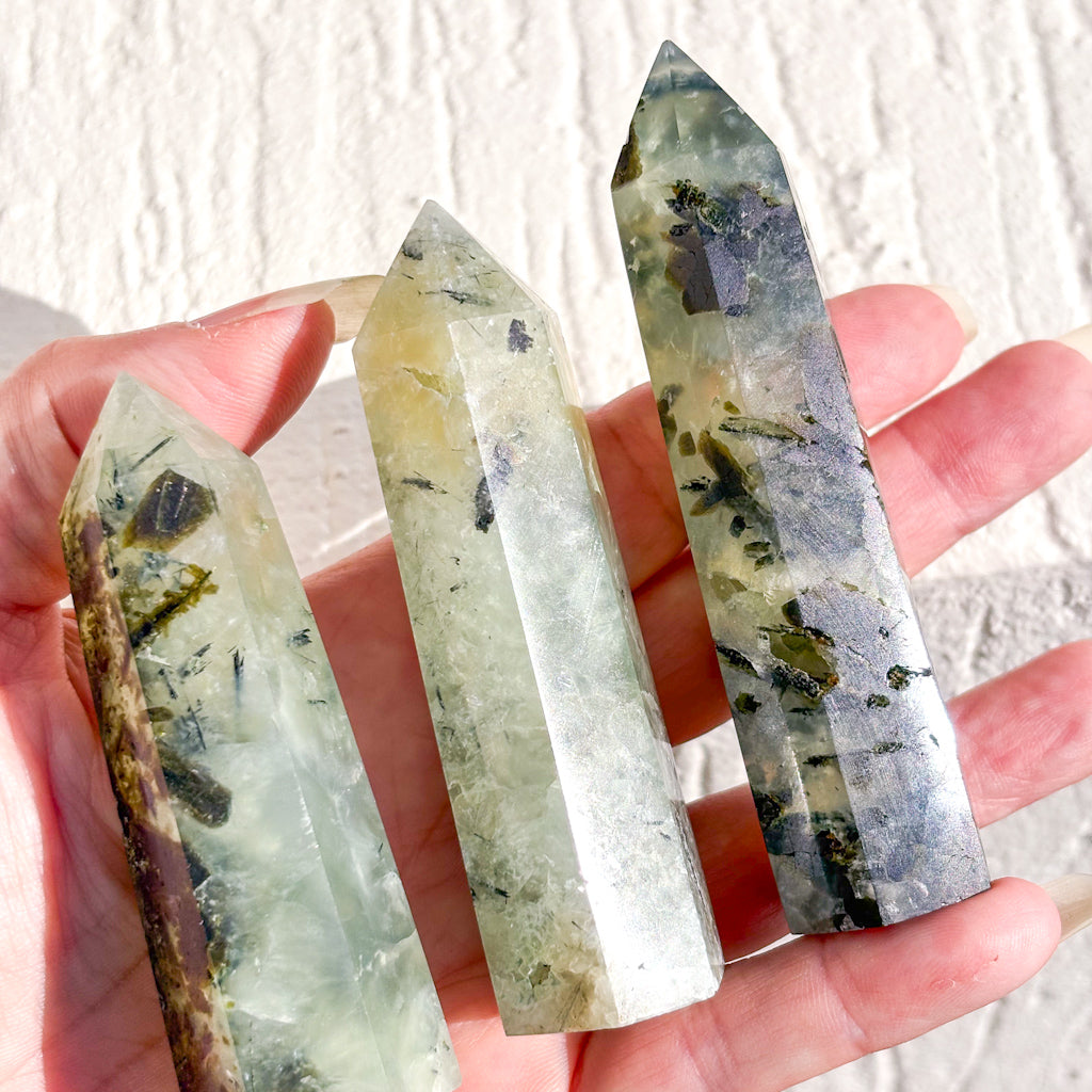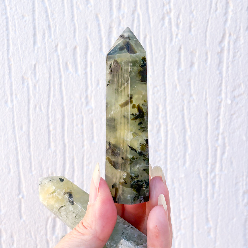 Purchase Prehnite crystal point tower online now from Six things shop Australia.
