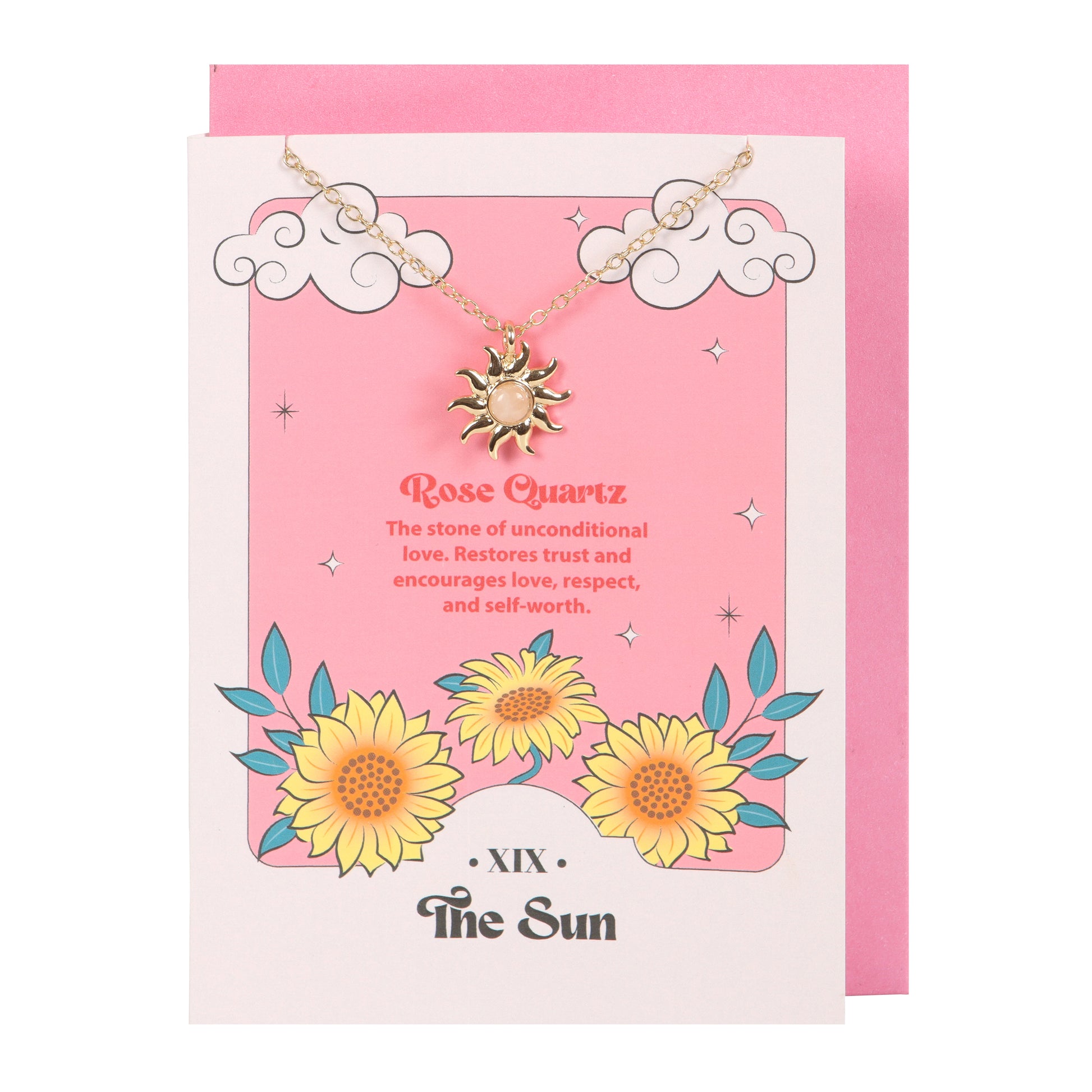 SUN ROSE QUARTZ PENDANT NECKLACE - This stainless steel necklace features a sun pendant with a rose quartz crystal. Presented on a colourful greeting card inspired by 'The Sun' tarot card designs, and text describing the benefits of rose quartz: "The stone of unconditional love. Restores trust and encourages love, respect and self-worth". Pink envelope included for easy gifting.