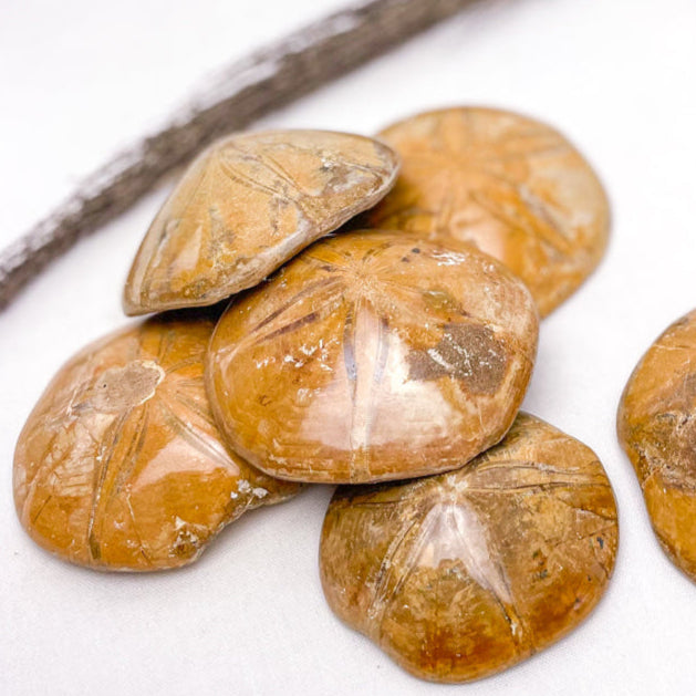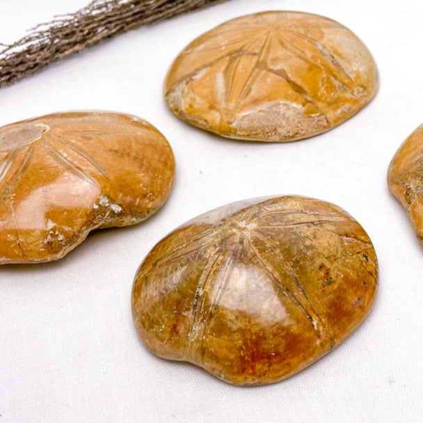 Fossils have a very calming and soothing energy promoting feelings of tranquility, contentment and comfort. Fossils assist one in business endeavors. Sea Urchin fossils align you with the powers of the ocean while providing you stability, security and focus in times of personal change. Sea Urchin sand dollar fossil carries a deep connection to the ebb and flow of energy as experienced through the waters of the sea. These fossils were created through millions of years, through ancient periods of time on Earth and therefore resonate with layers of natural energy. Though skeletal they are vibrant fossils that live through the richness and depth of their colours in tan, gold, brown and ochre. Through this stone you will find balance & harmony while removing the negative energy blockages and giving you clarity. As once living beings each Sea Urchin stone has its own meaning and own personality.