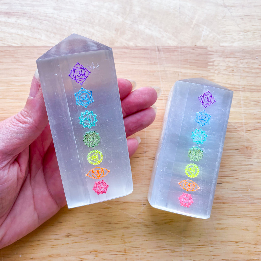 Purchase Selenite crystal carved tower with Chakra engraving online now from Six things shop Australia.