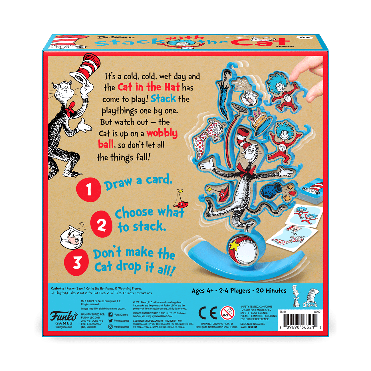Dr Seuss Stack with a Cat Board Game in it a cold wet day and the cat in the hat has come to play! Stack the playthings one by one. But watch out—the cat is up on a wobbly ball, so don’t let all the playthings fall! Draw a card. Choose a plaything to stack on the cat in the hat. Be careful— don’t make the cat drop it all. Two modes of play, choose to play either cooperatively or competitively. Easy to set up and easy to clean up.Play with the beloved and classic literary character. For ages 4 years and up.