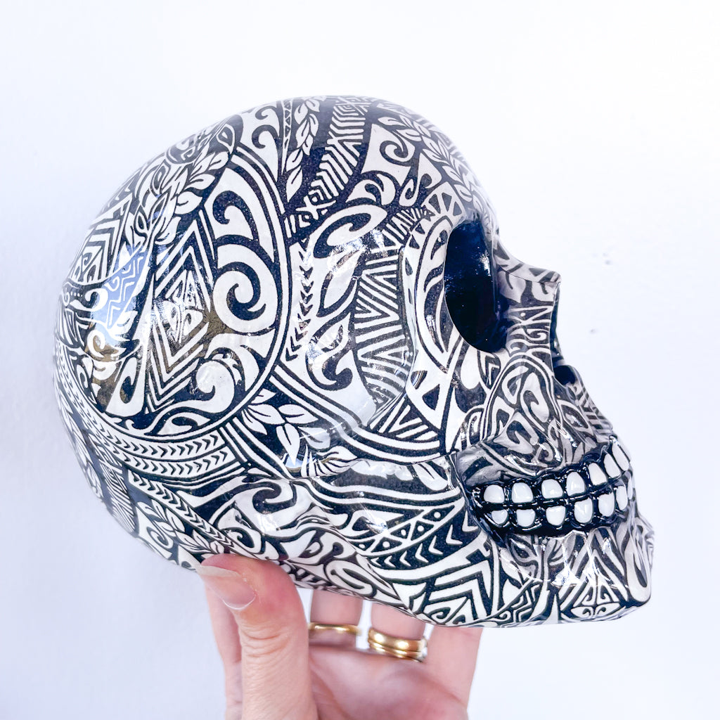 This monochrome black and white painted skull is filled with celtic knots, ocean themes and tribal tattoos in the style of a Maori Haka Warrior.