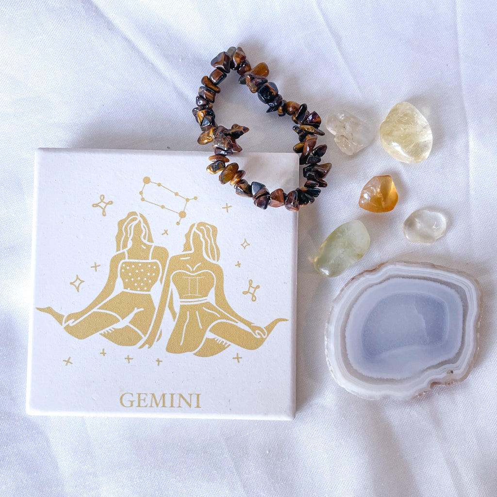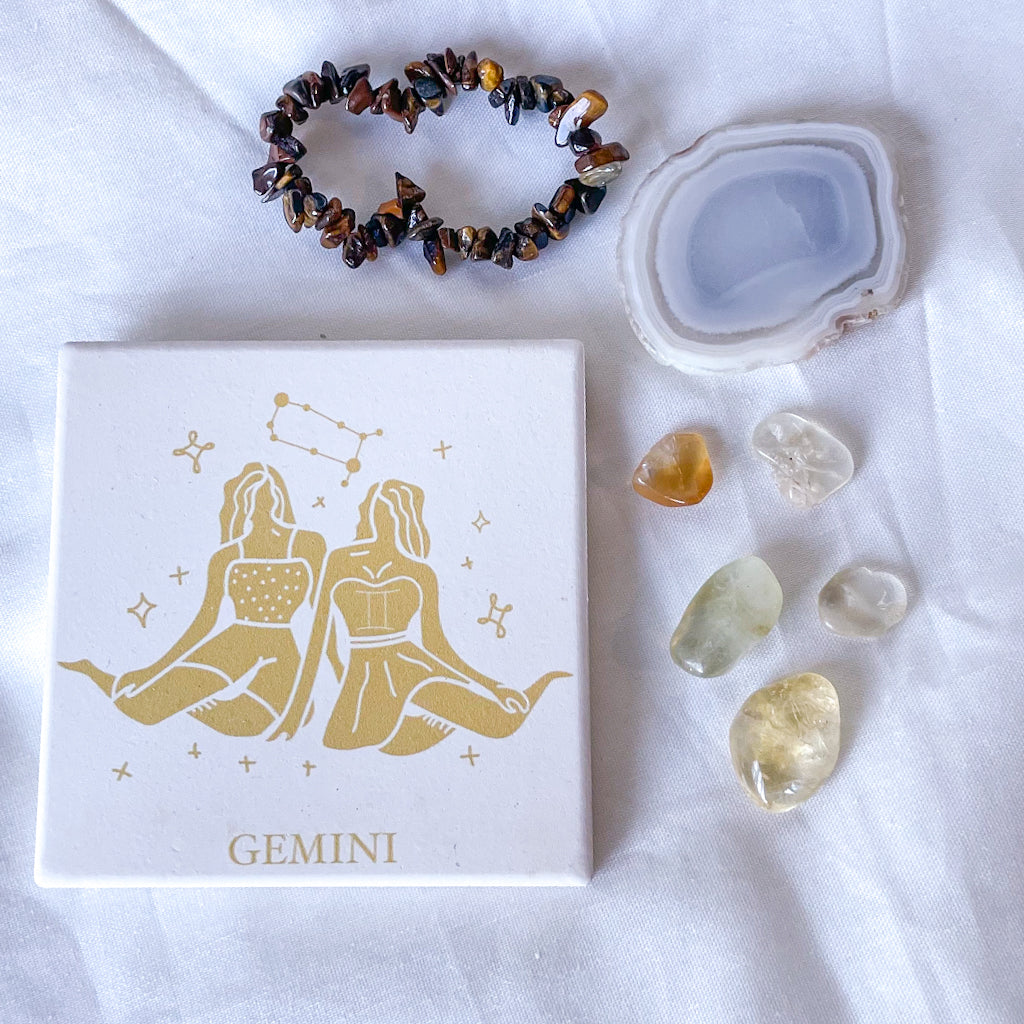 Each crystal kit contains 5 pieces including selected GEMINI gemstones used to enhance + protect those under the Zodiac Sign, a beautiful zodiac ceramic tile and the GEMINI gemstone meanings.